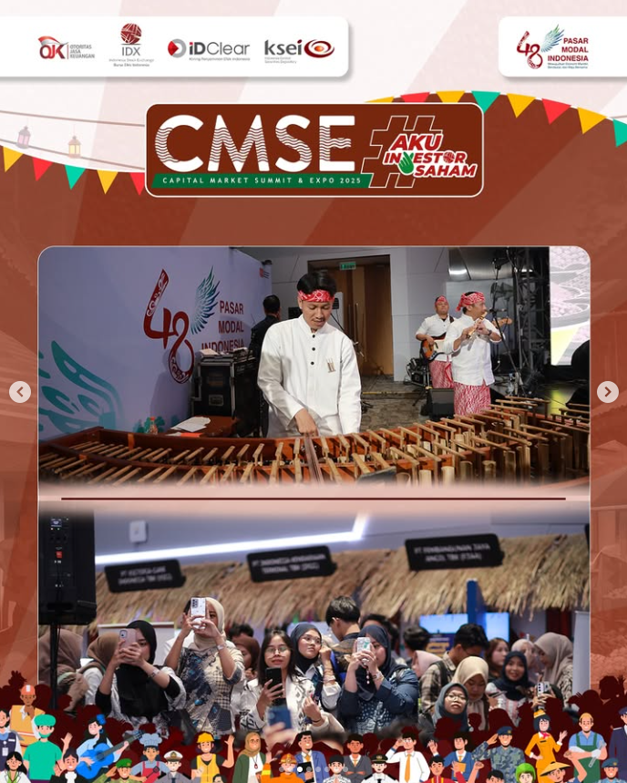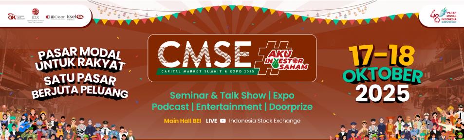 CMSE 2025 yang menjadi ajang temu bagi para pemangku kepentingan pasar modal Indonesia ini akan diselenggarakan di Main Hall Bursa Efek Indonesia selama 2 (dua) hari berturut-turut pada 17 – 18 Oktober 2025. CMSE 2025 menyajikan 6 (enam) sesi kegiatan seminar dengan beragam topik yang menarik di pasar modal, serta dimeriahkan dengan doorprize dan hiburan, serta menghadirkan 95 tenant (88 booth) dari pelaku pasar/industri dan UMKM.