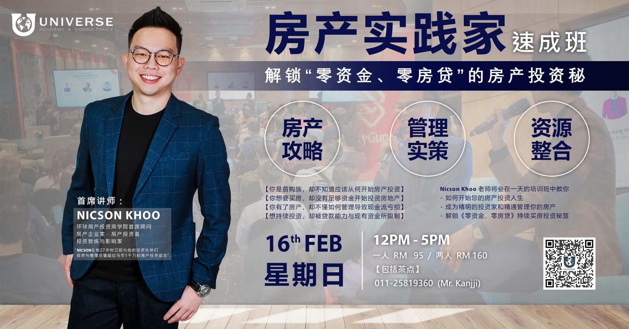 【你是首购族,却不知道从哪里开始房产投资】【你是打工族,却没有那么多资金投资房地产吗】【你拥有数间房产,可是却不会管理而导致资金不足】【你想继续投资更多房地产,可是个人贷款能力与现有资金已经爆表】你是以上说的几位吗?你知道要怎么解决你目前在房产投资的疑惑了吗?【房产实践家速成班】Nicson Khoo 将会在一天的培训班中教你- 如何开始您的房产投资人生- 成为精明的投资家和精通管理你的房产- 解锁《零资金、零房贷》的房产投资秘笈无论是投资还是自住,Nicson Khoo的独家培训班能让身为首购族的您深入了解如何开始购买您的第一间房;也让身为拥有几间房产的你学会如何精明管理你的房地产、如何从房地产获利、如何避免在房地产投资中犯下错误及学会以零资金、零房贷一买再买的独家房产投资模式。名额有限,现在就报名参加吧!