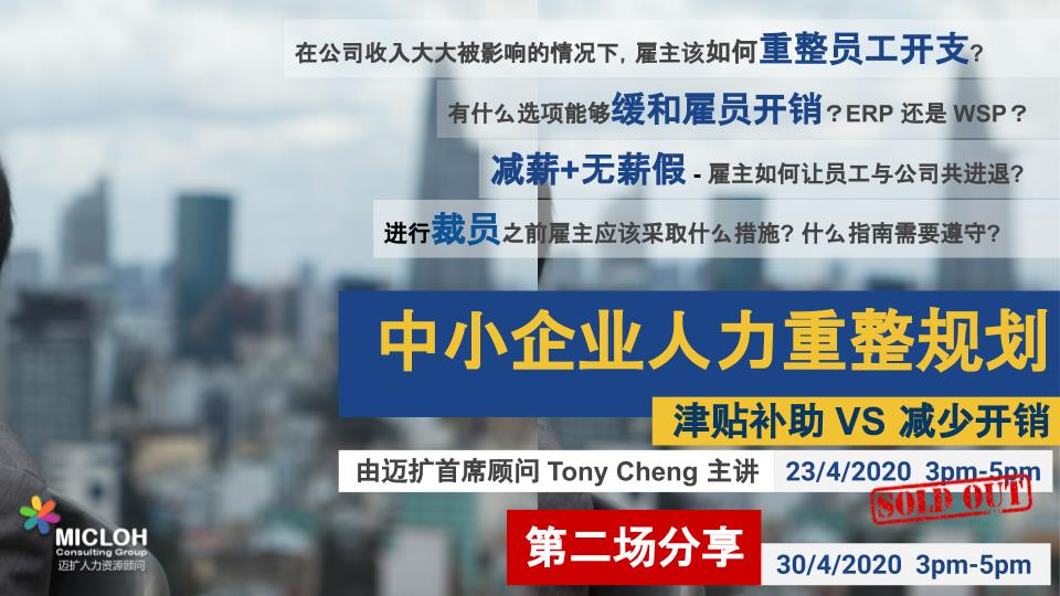 由于第一场线上课程反应热烈, 迈扩决定在4月30日, (星期四 ) 下午3点至5点加场进行第二场《中小企业人力重整规划:津贴补助 VS 减少开销》线上工作坊。由迈扩首席顾问Tony Cheng与大家探讨及分享以上所提到种种问题及解决方法。
