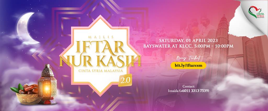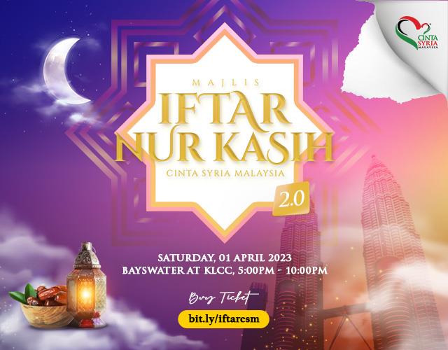 Iftar Nur Kasih 2.0 is intended to raise funds for Ramadan Mission 10.0 where the collected donations will be distributed in the form of food parcels, hot meals, Eid clothes, education assistance, and community development in Syrian refugee camps around Turkiye, Lebanon, Syria, Jordan, and Malaysia. Part of the proceeds will be allotted to the Earthquake victims. This event also aims to instill awareness among Malaysian citizens regarding Syria's humanitarian crisis. The attendees to this event are Noh Salleh (Hujan), Faizal Tahir, Aizat Amdan, Zizi Kirana, Dr Samhan, Ustaz Amin, Khairul Hakimin Muhammad, and Dr Maiza which have shown tremendous support to the humanitarian mission with CSM.