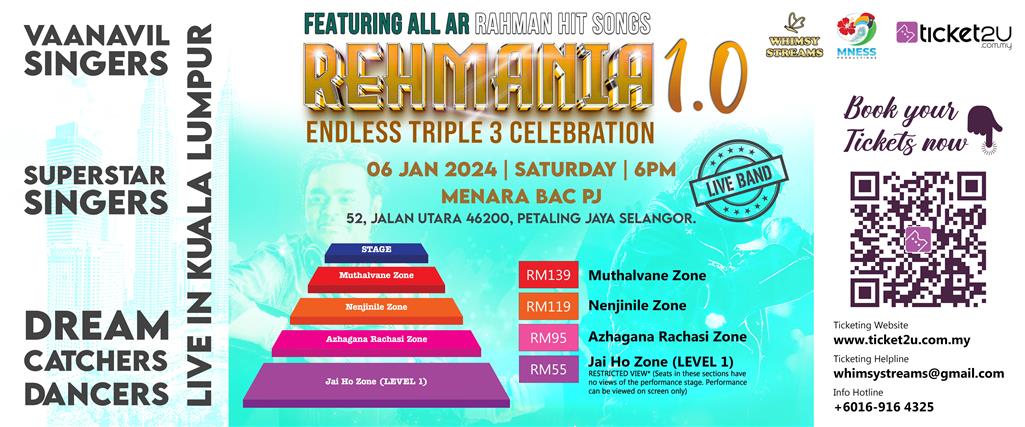 • Purchase of ticket shall only be made in our designated website at https://www.ticket2u.com.my/(“Website”), Any Ticket purchased from any other source may be unauthorised copies and purchaser(s) may be refused admittance to the Event.