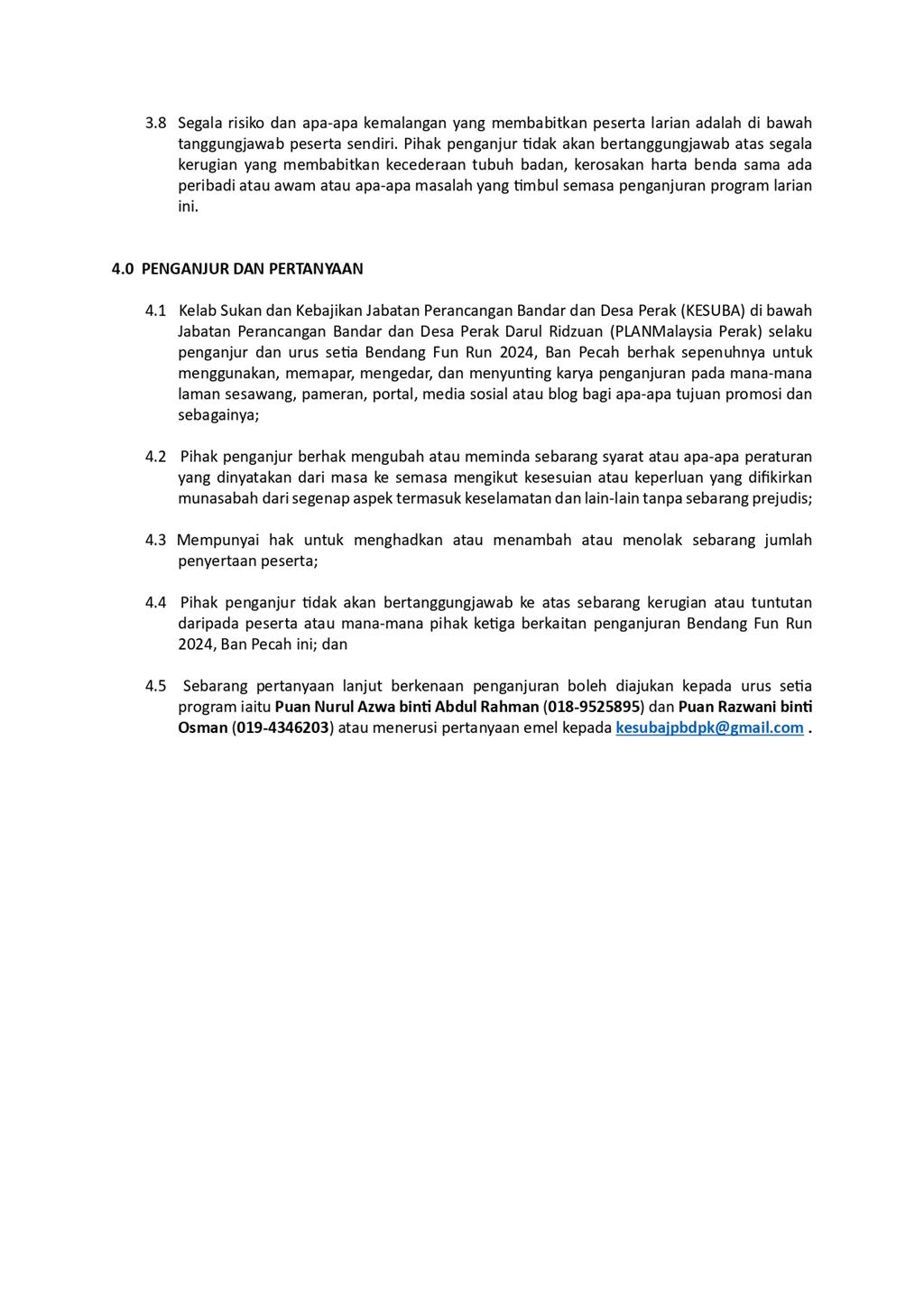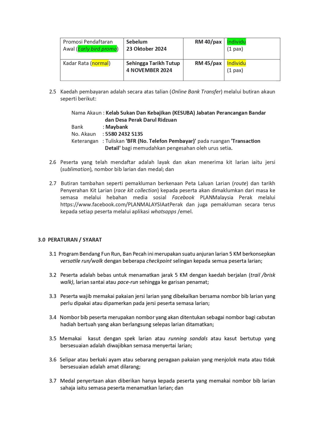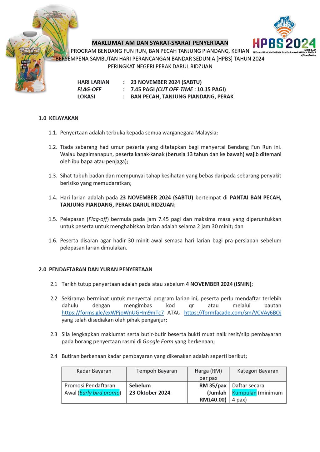 Sukakan GAYA HIDUP SIHAT? Jom hangpa semua sertai ✨ *BENDANG FUN RUN @BAN PECAH 2024* sempena *Sambutan Hari Perancangan Bandar Sedunia Peringkat Negeri Perak* anjuran Kelab Sukan dan Kebajikan (KESUBA), Jabatan Perancangan Bandar dan Desa Perak Darul Ridzuan. Bila tu? Ok JOM SET OUR DATE