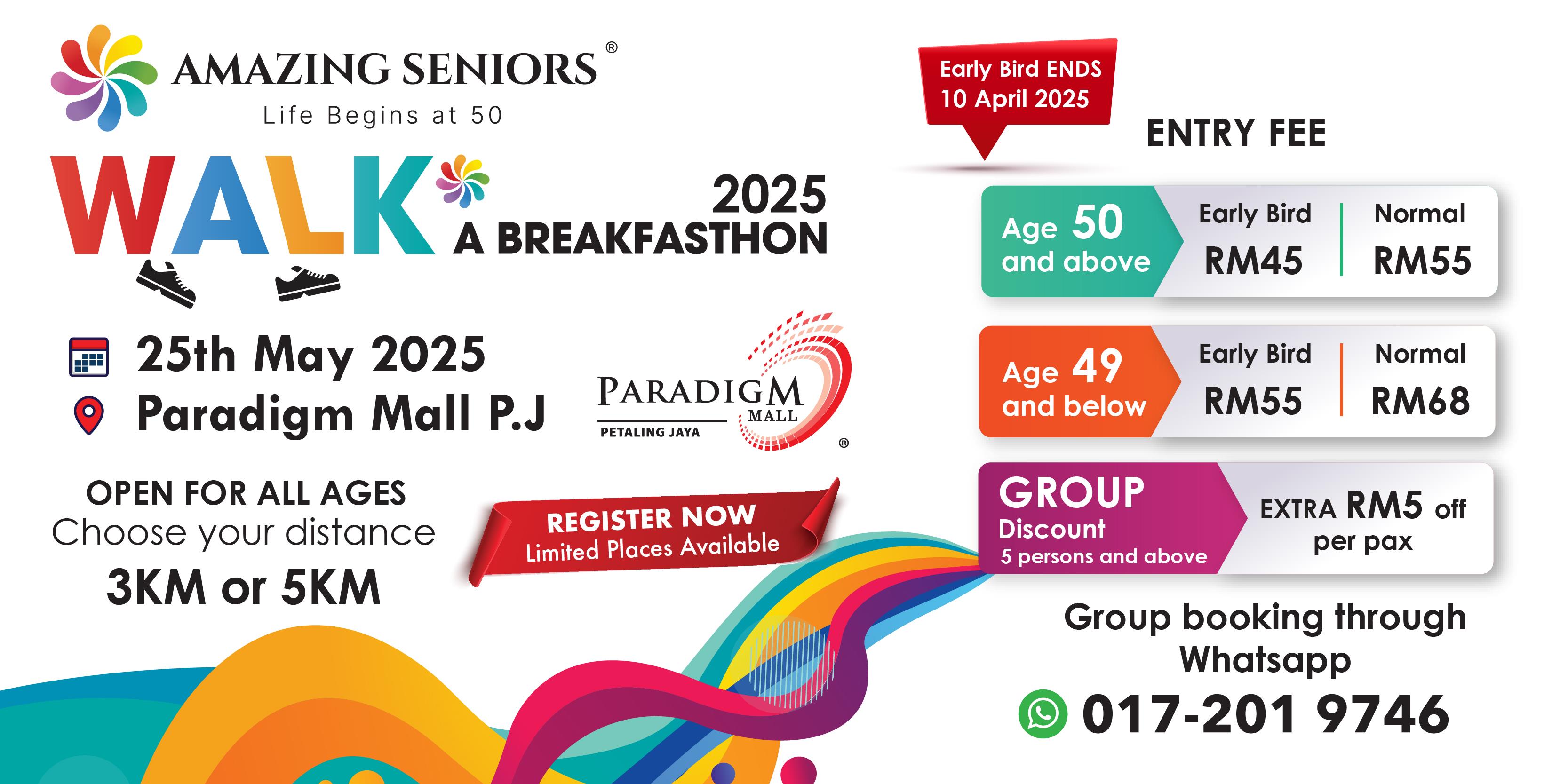 - Parents are allowed to bring along their children below the age of 5 at their own risk. Parents must take full responsibility of their children’s wellbeing pre, during and after WALK A BREAKFASTHON 2025. NO registration is required for children aged below 5 years and therefore they will not be entitled for t-shirt, finisher medal, etc. Organizer cannot be held responsible for the safety and wellbeing of any child below the age of 5 years.