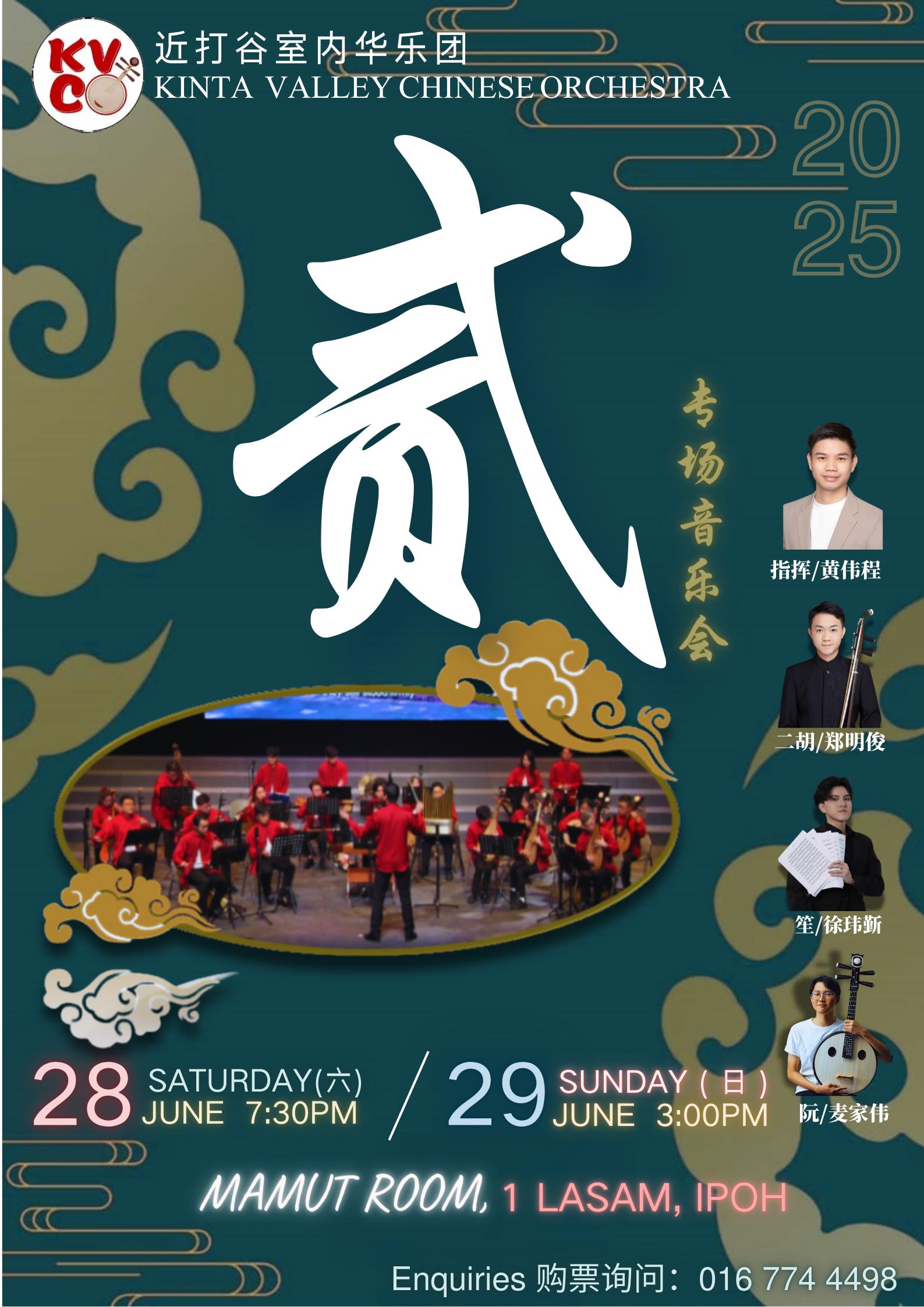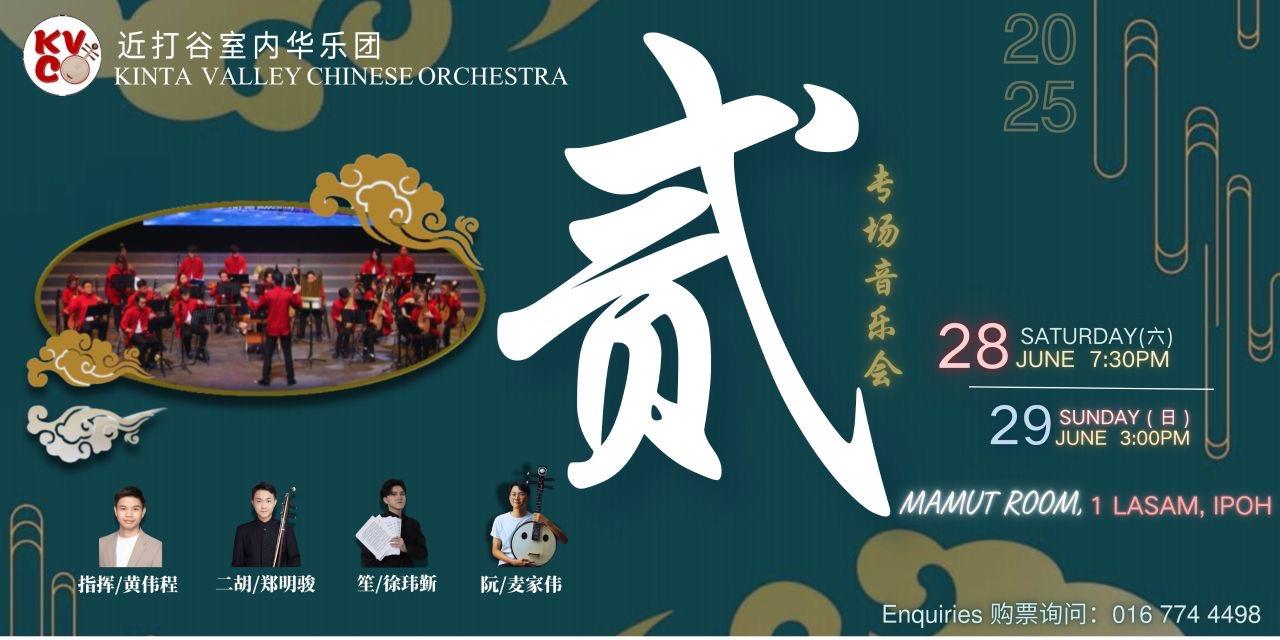Music Concert - "II" is the second annual concert by the Kinta Valley Chinese Orchestra. The program has been thoughtfully curated to reflect the orchestra’s mission, featuring a rich and diverse repertoire including three concertos, a work by local Ipoh composer, contemporary-style pieces, and Cantonese music. It also serves as a platform for the next generation of talented Chinese music performers to showcase their artistry through several featured pieces.