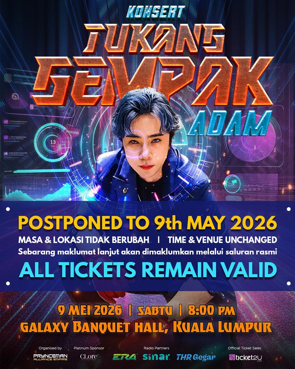 & adalah sama sekali. Untuk makluman, konsert ini hanya , bukan dibatalkan. Justeru, semua tiket yang telah dibeli adalah dan boleh digunakan pada tarikh yang baru.