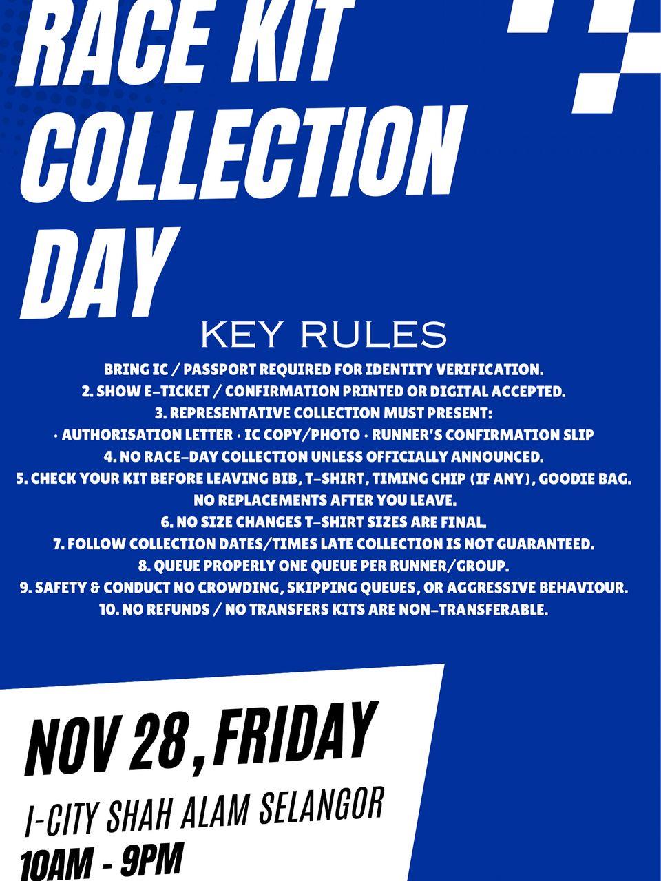 6.There will be STRICTLY NO distribution of kits on race day.