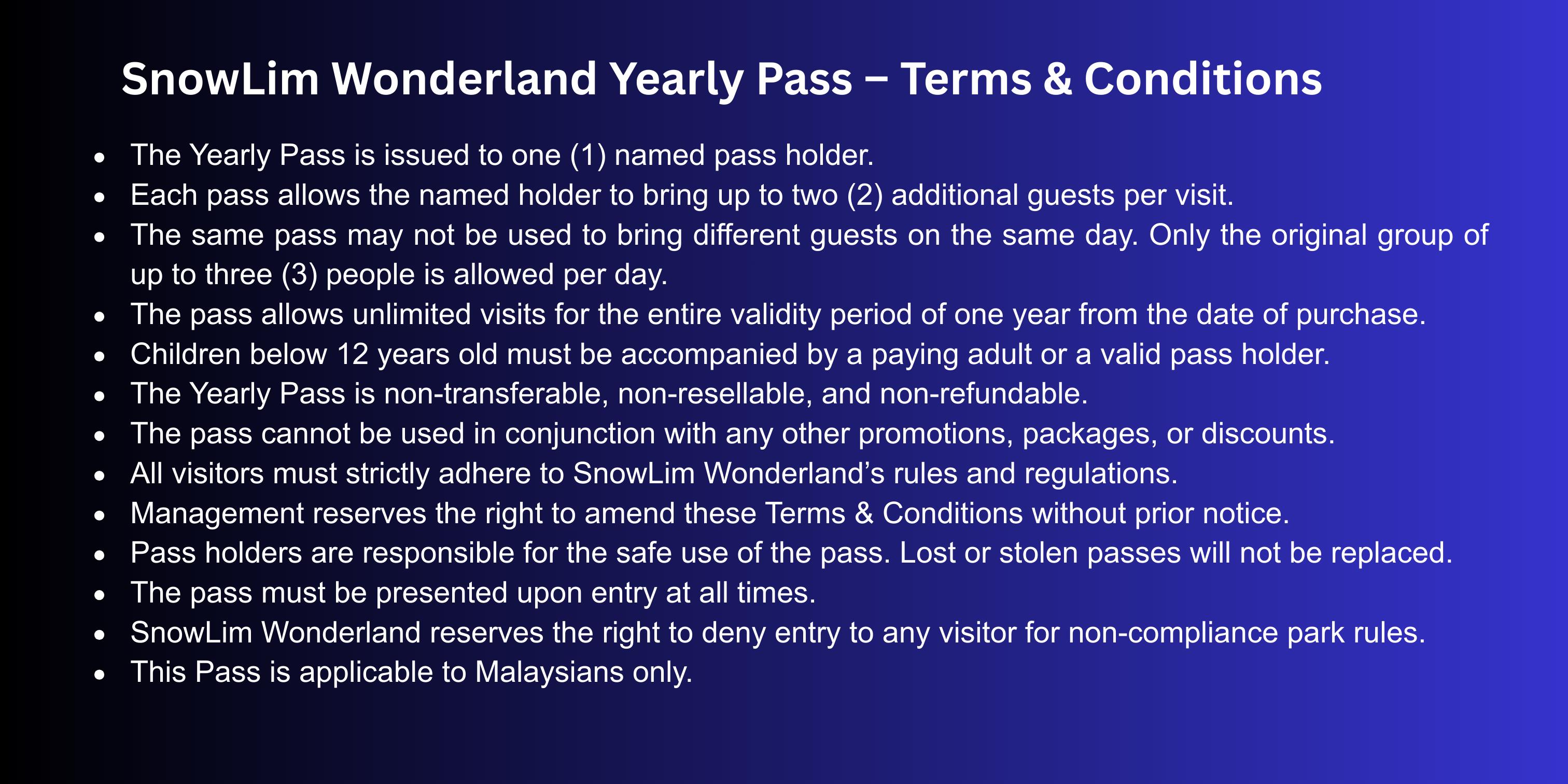 To facilitate contactless access, you are required to register your face with the provided facial recognition link by uploading a photo of the assigned snowlim yearly pass holder. Thereafter you may directly enter and re-enter into snowlim wonderland theme park within the validity of the snowlim yearly pass via facial recognition system. You may leave and re-enter the parks on the day(s) of your play conveniently with contactless access via our facial recognition system.