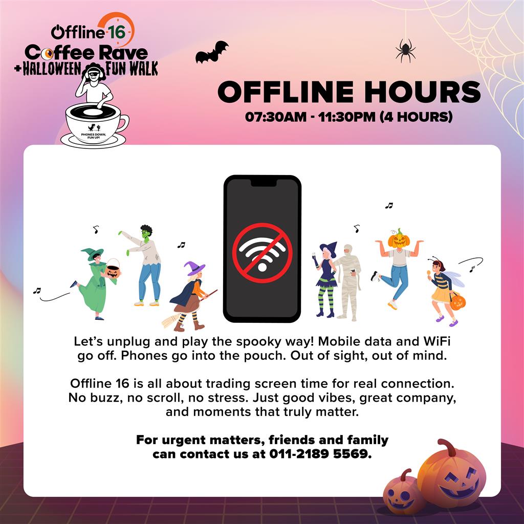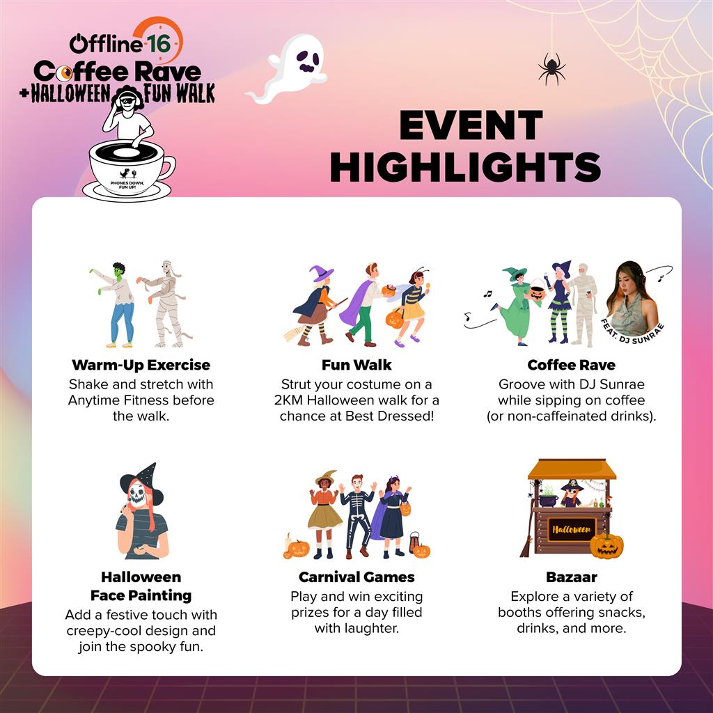 Rave. Recharge. Reset. It’s time to unplug with Offline 16: Coffee Rave + Halloween Fun Walk! Lace up for a light-hearted 2KM Fun Walk in your best Halloween costume, then dive into the ultimate Coffee Rave with DJ Sunrae, where music and community come alive, all without your phones.