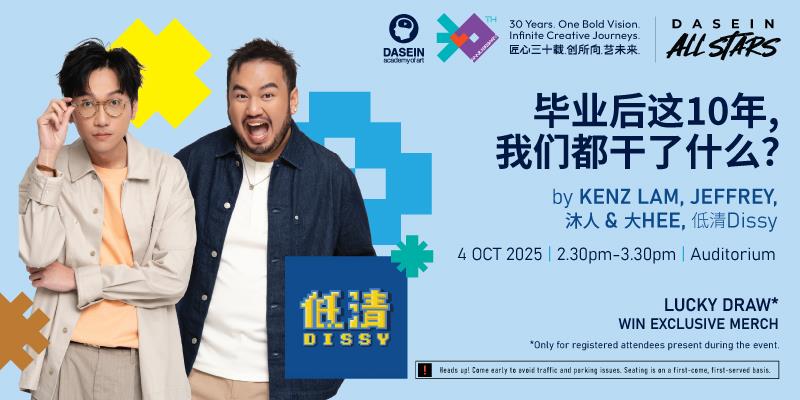 于2025 年10月4日,Dasein Academy 艺术学院将迎来建校 30 周年的重要时刻,以一天的庆典 致敬创意、连结与社区。 在这场特别的分享中,「低清 Dissy」将以四位 Dasein 毕业生的视角,娓娓道来他们十 年来的成长与人生轨迹。 这十年,他们学到了什么?社会又赋予了他们怎样的智慧与成长? 欢迎走进这场叙事分享,聆听这些杰出校友的真挚心声。