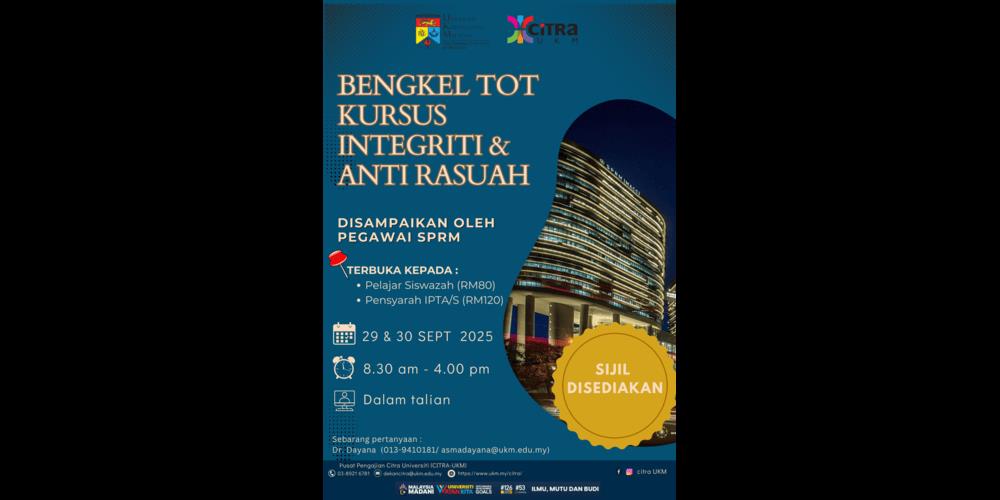 The Training of Trainers (TOT) Workshop on Integrity and Anti-Corruption Course organized by the Citra Study Centre, UKM University aims to strengthen understanding and awareness of the importance of integrity in the education profession as well as to encourage anti-corruption practices among teaching staff and students in particular. This training will also provide teaching staff with the knowledge and skills needed to effectively deliver the content of this course to students. This workshop will be delivered by MACC officers. In addition, it is a great advantage for workshop participants because a ToT certificate will be given since this Integrity and Anti-Corruption Course is a mandatory course for bachelor's degrees at IPTA/S.
