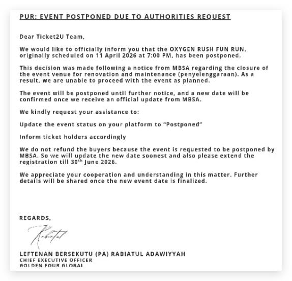 6.2 In the event of bad weather, natural disasters, government restrictions, safety concerns, or unforeseen circumstances beyond the organizer’s control (force majeure), the organizer reserves the right to: