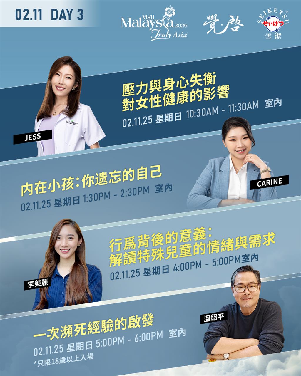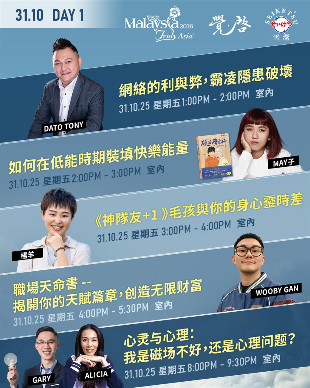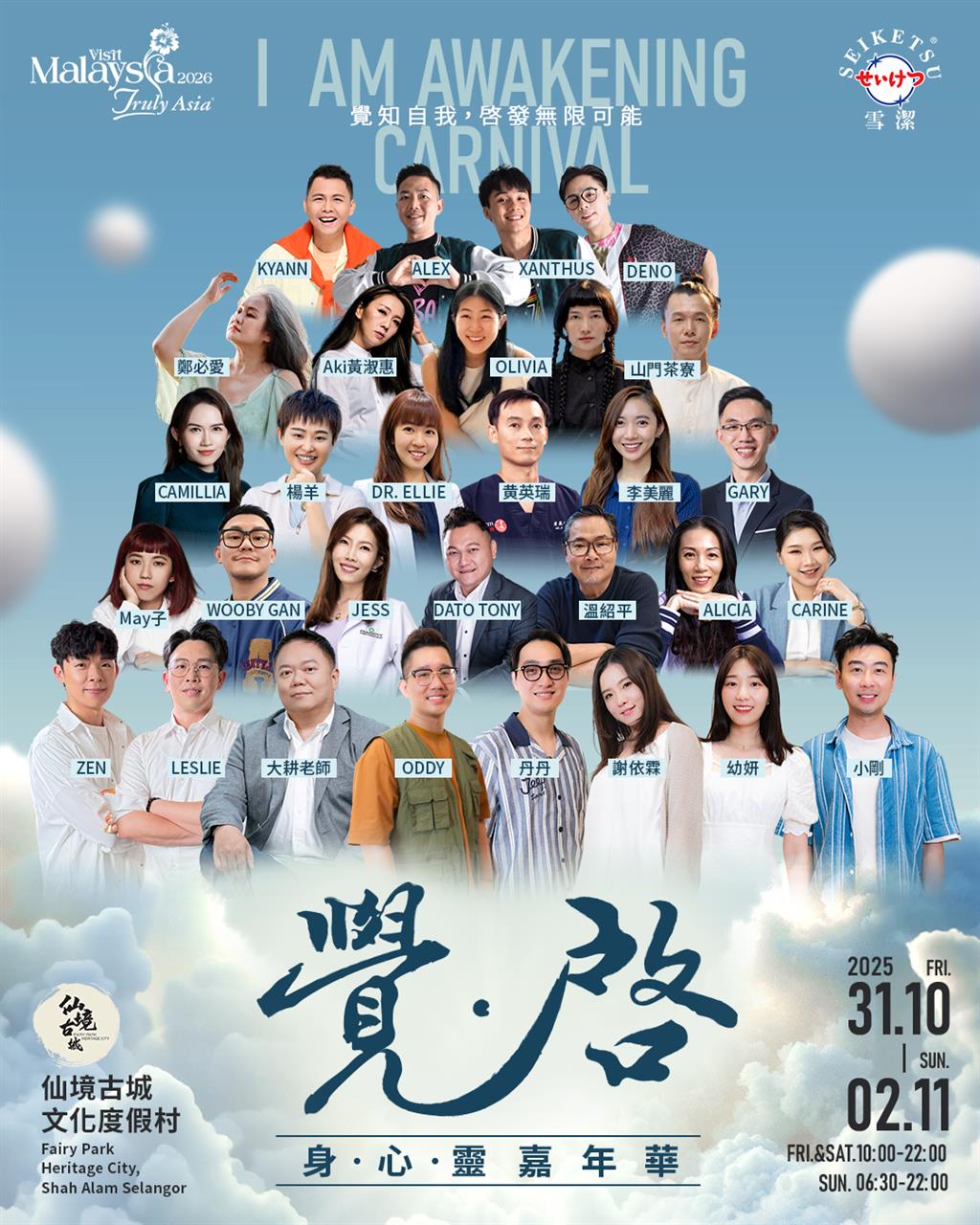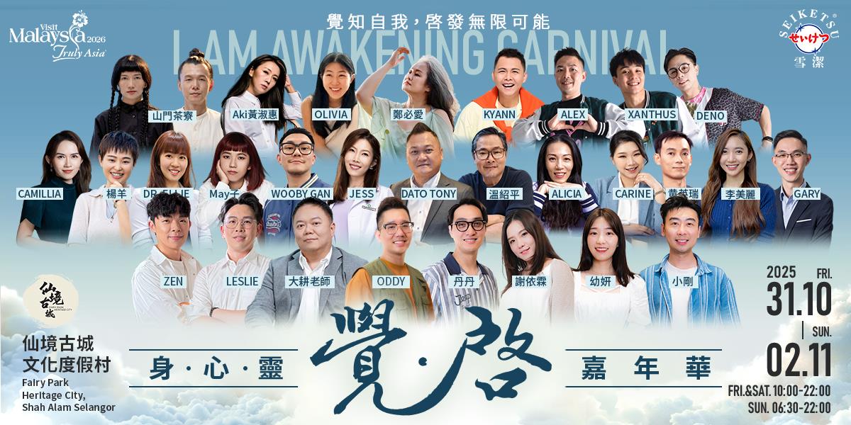 🌟【覺·啓】 身心靈嘉年華 🌟海內外分享導師正式亮相!這是一場前所未有的盛典 ——馬來西亞真正屬於 【你 · 我 · 他】 的身心靈嘉年華。我們用最真誠的心,籌辦了一場以 健康 · 心理情緒 · 意識提升 為核心的嘉年華。📅 日期:2025年10月31日(五)- 11月2日(日)🕙 時間:10:00AM – 10:00PM (週日 6:30AM – 10:00PM)📍 地點:太和殿,仙境古城 @ Setia Alam✨ 三天精彩內容 ✨✅ 健康生活分享會(專業醫師 & 治療師團隊)✅ 海內外導師專題分享(本地 & 台灣)✅ 療愈音樂祭✅ 家庭日 Fun Run✅ 兒童填色比賽✅ 身心靈市集 & 美食街✅ 戶外 Zumba 健康舞蹈✅ IMU 國際醫療大學 - 免費驗血體檢✅ PPUM & HTAR - 公益捐血活動✅ 中醫義診 & 整骨義診💖 這不是一場普通的活動,這是一場翻頁人生的契機。三天裡,你將遇見最真實落地的分享,最深刻的療癒體驗。🔥 最特別的是 🔥👉 本地導師分享會門票 單日 RM30👉 100% 全額捐出 —— 用於學校搬遷、醫院與非政府組織 (NGO) 的洗腎中心,幫助最需要的人!👉 每一位購買入門票的參與者,都將獲得一次機會,參加大會的 幸運抽獎 🎁這代表著:🎟 每一張票,不僅是你對自己的投資,更是一份對社會的愛心。即使您無法出席,也能透過購票,成為改變別人生命的力量。✨ 覺知自我,啓發無限可能 ✨讓我們一起,為自己 · 為家人 · 為社會,點燃更多正能量!