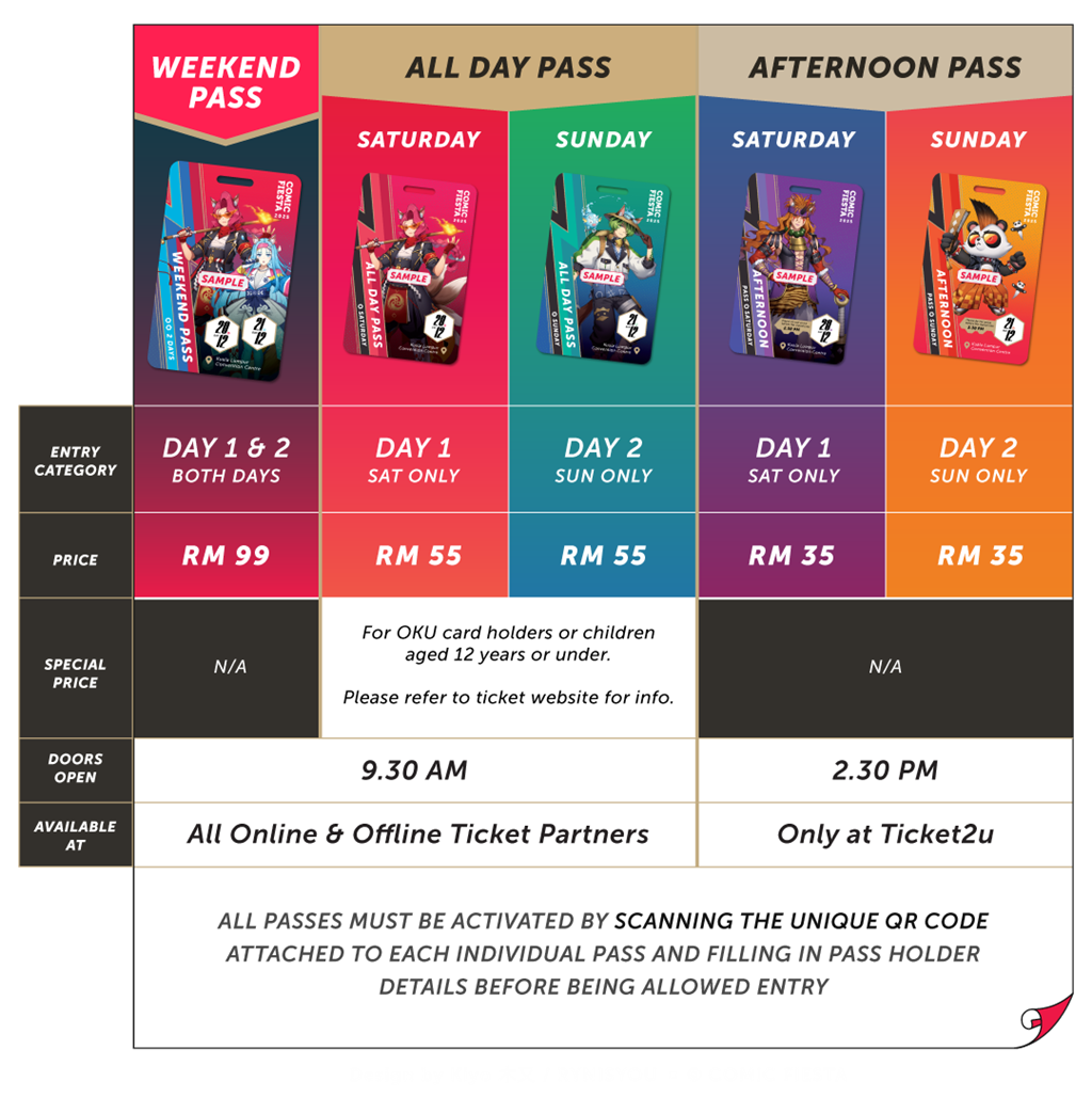 Purchase of ticket shall only be made in our designated website at https://www.ticket2u.com.my/(“Website”) and other sources at http://ticketing.comicfiesta.org. In the event that the purchaser provides false or incorrect data when making the purchase, the purchaser may be barred from attending the Event.