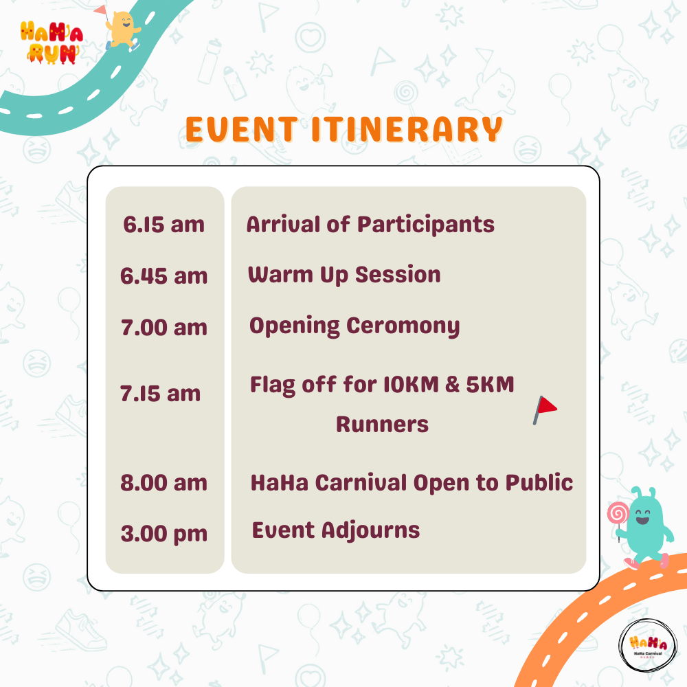These Terms & Conditions govern participation in the Haha Run. By registering, participants agree to abide by all rules set by the Organizer. The Organizer reserves the right to modify, substitute, or update these terms and event rules at any time without prior notice. If there is any ambiguity in any of the provision of the terms, the Organizer will be the authority to interpret and in so doing, the Organizer will take into account the interest of all affected participants. The decision of the Organizer shall be final and binding. If there is any changes of the event, it is the responsibility of the participants to keep abreast with such updates and changes.