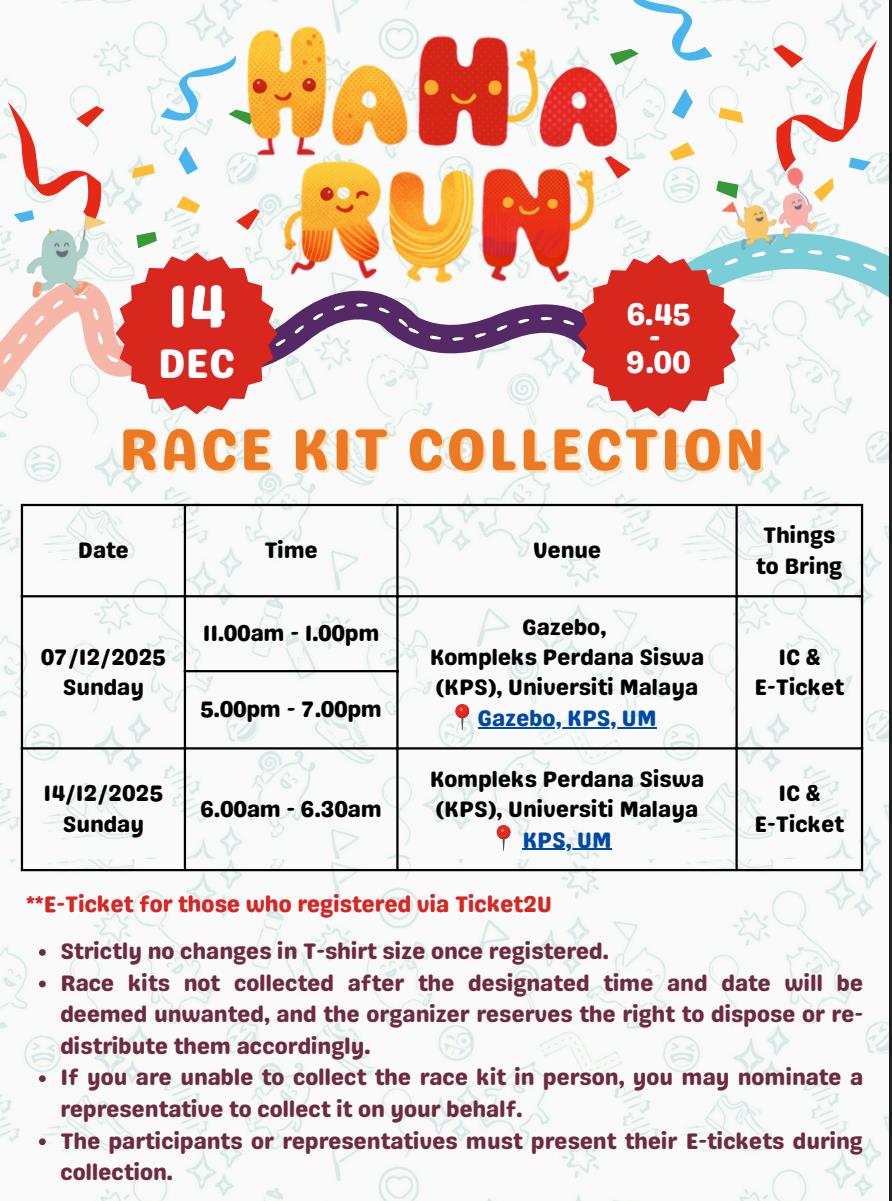 - Race kit (bib, event T-shirt, and other items) must be collected during the designated collection period. Late collection will not be entertained, and uncollected kits may be disposed of or redistributed. The Organizer may extend the collection time at the Organizer discretion and on a goodwill basis only. For the avoidance of doubt, the Organizer is not obliged to extend the collection time or to ensure the participant receive their race entry pack.