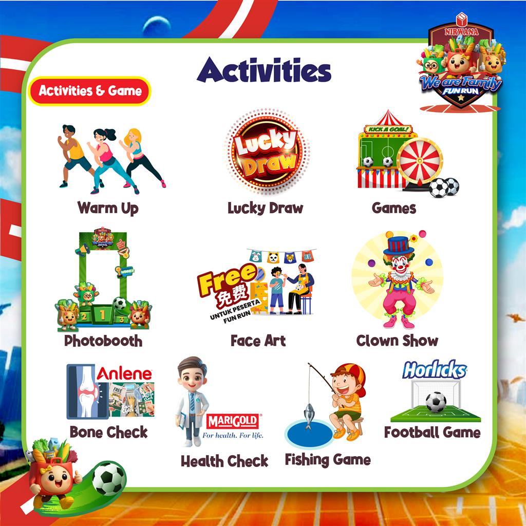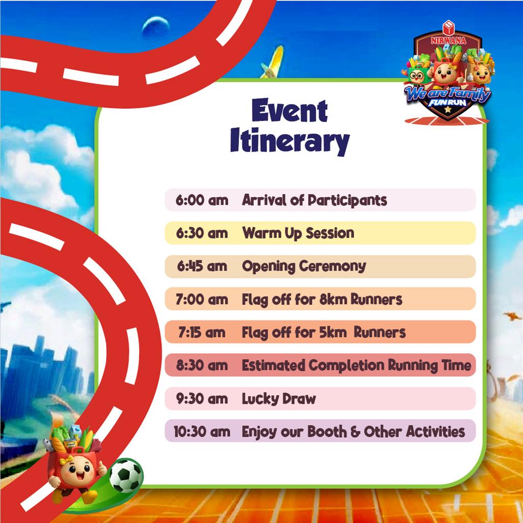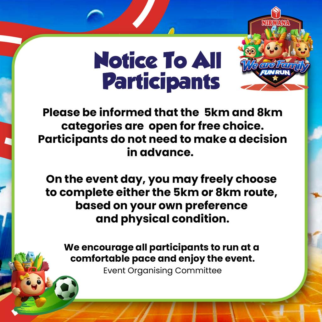 These Terms & Conditions govern participation in the Nirwana Fun Run 2026 - We are Family! By registering, participants agree to abide by all rules set by the Organizer. The Organizer reserves the right to modify, substitute, or update these terms and event rules at any time without prior notice. If there is any ambiguity in any of the provision of the terms, the Organizer will be the authority to interpret and in so doing, the Organizer will take into account the interest of all affected participants. The decision of the Organizer shall be final and binding. If there is any changes of the event, it is the responsibility of the participants to keep abreast with such updates and changes.