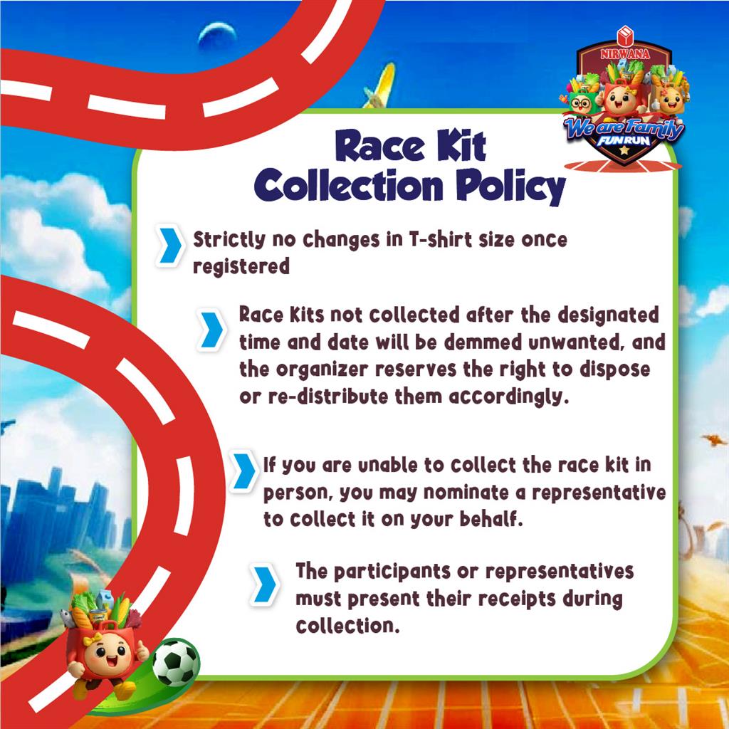 - Race kits not collected after the designated time and date will be deemed unwanted, and the organizer reserves the right to dispose or re-distribute them accordingly.