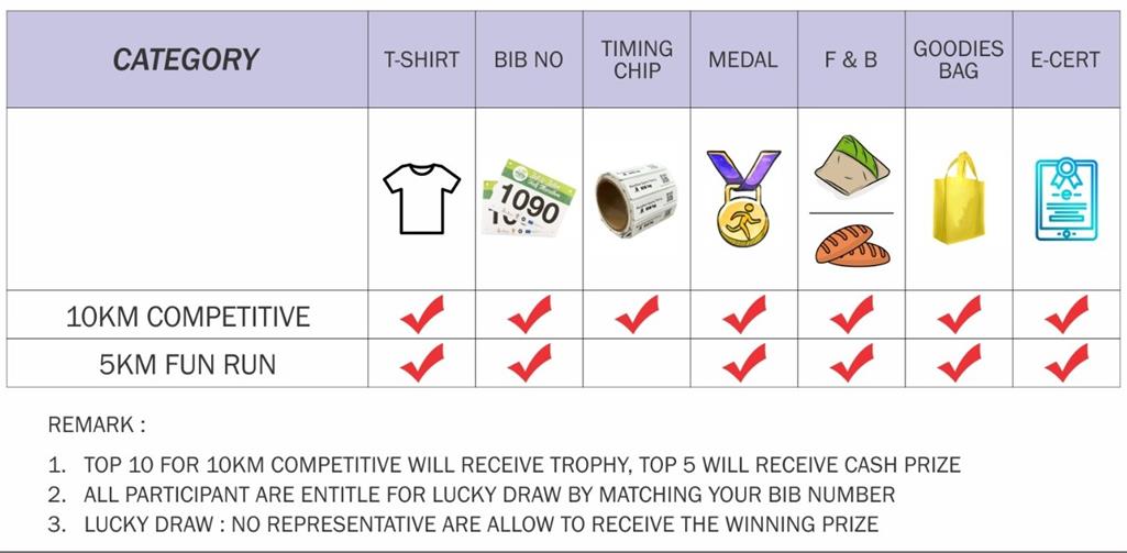 - Successful participants MUST collect their race bib number, race shirt, and souvenirs (“Race Kit”) (in person or via an authorized person) by presenting the copy of Official Receipt and identity card (as stated in the official receipt).