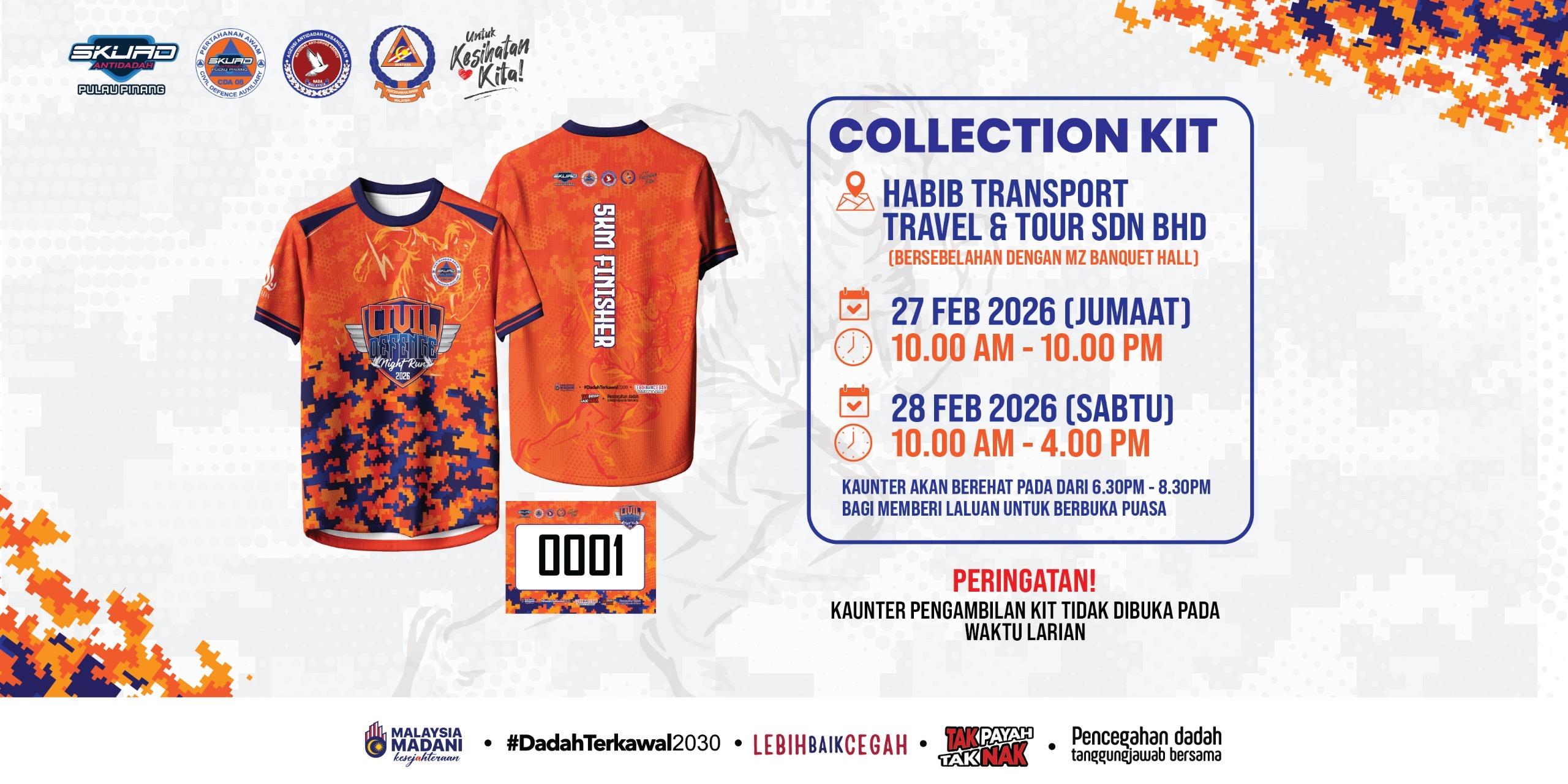 7. Pengambilan kit perlumbaan hanya dibenarkan pada tarikh dan waktu yang telah ditetapkan oleh pihak penganjur. Sebarang pengambilan pada waktu hari acara TIDAK dibenarkan dalam apa jua keadaan.