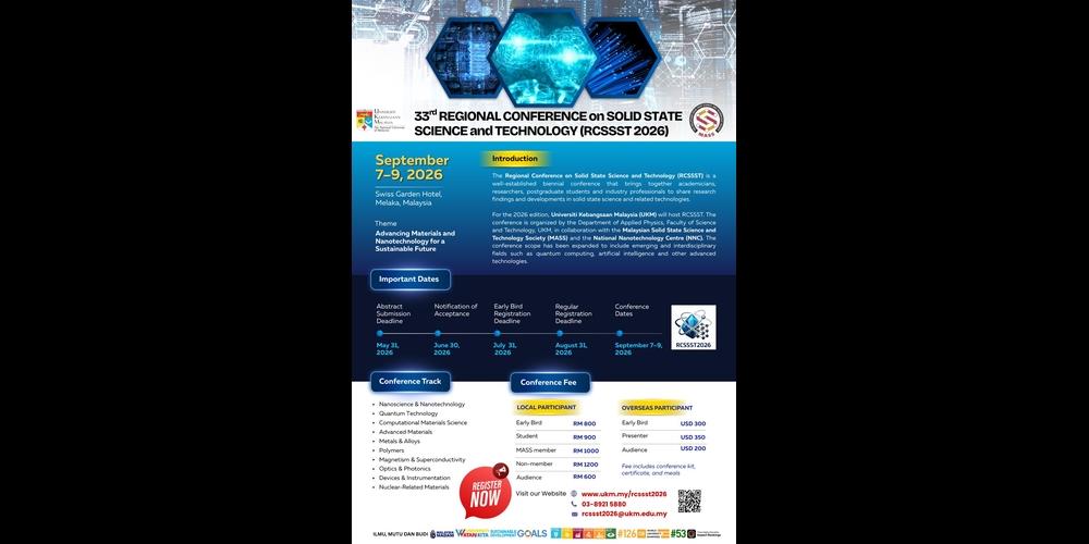 For the 2026 edition, Universiti Kebangsaan Malaysia (UKM) will host RCSSST. The conference is organized by the Department of Applied Physics, Faculty of Science and Technology, UKM, in collaboration with the Malaysian Solid State Science and Technology Society (MASS) and the National Nanotechnology Centre (NNC). The conference scope has been expanded to include emerging and interdisciplinary fields such as quantum computing, artificial intelligence and other advanced technologies.