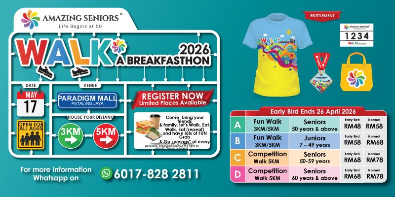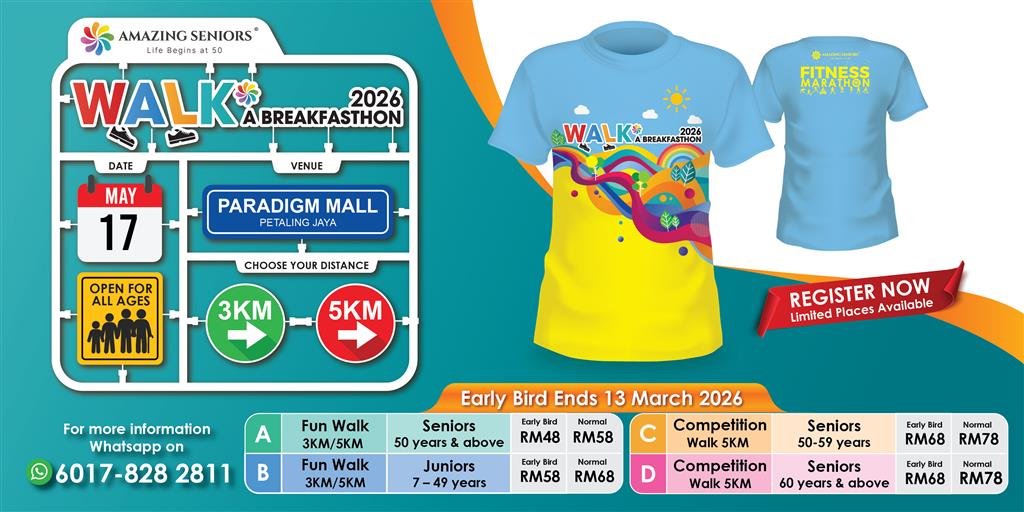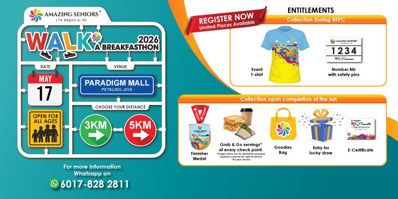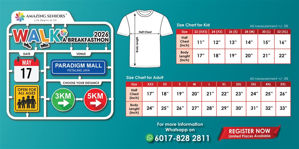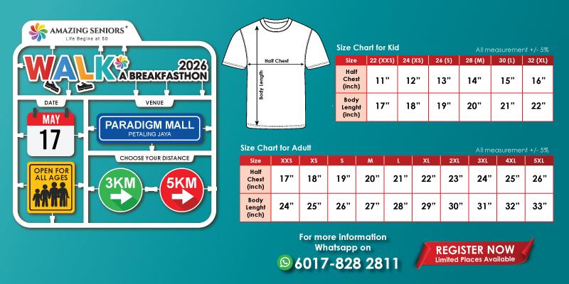 - Parents are allowed to bring along their children below the age of 7 at their own risk. Parents must take full responsibility of their children’s wellbeing pre, during and after WALK A BREAKFASTHON 2026. NO registration is required for children aged below 7 years and therefore they will not be entitled for t-shirt, finisher medal, etc. Organizer cannot be held responsible for the safety and wellbeing of any child below the age of 7 years.