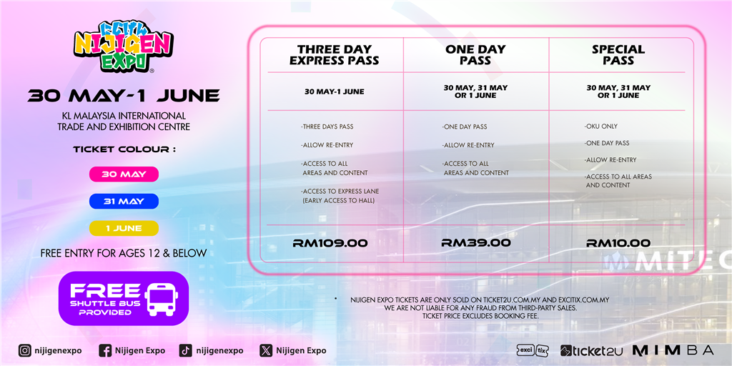 Terms and Conditions1. Please redeem your tickets with the QR code that will be sent to your email after your purchase. The redemption counter will be place at the entrance during the event.2. If we are open for early redemption before the event, details of the location will be announced in our official social media.3. Ticket sold is non-refundable, non-exchangeable, not for resale and non-replaceable.4. Nijigen Expo reserves the right to deny your entry if you have violated the rules in the event.5. Nijigen Expo reserves the right to vary and amend any of the terms and conditions without prior notice.6. Nijigen Expo ticket is only sold via Ticket2U.com.my. There is no other third party selling the ticket.7. We are not responsible for any damage or fraud caused by any third-party sales.8. Each ticket price EXCLUDES booking fees.