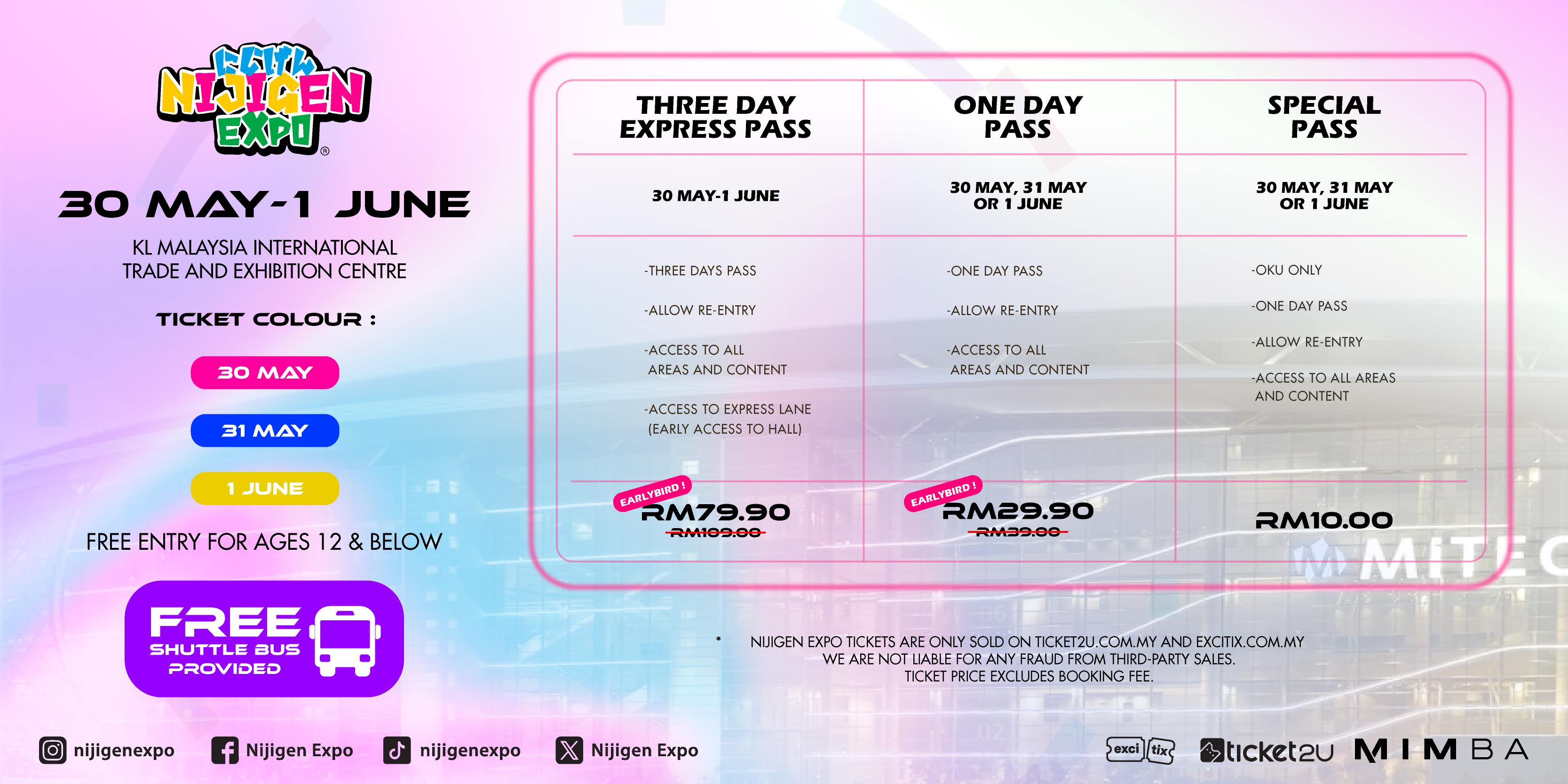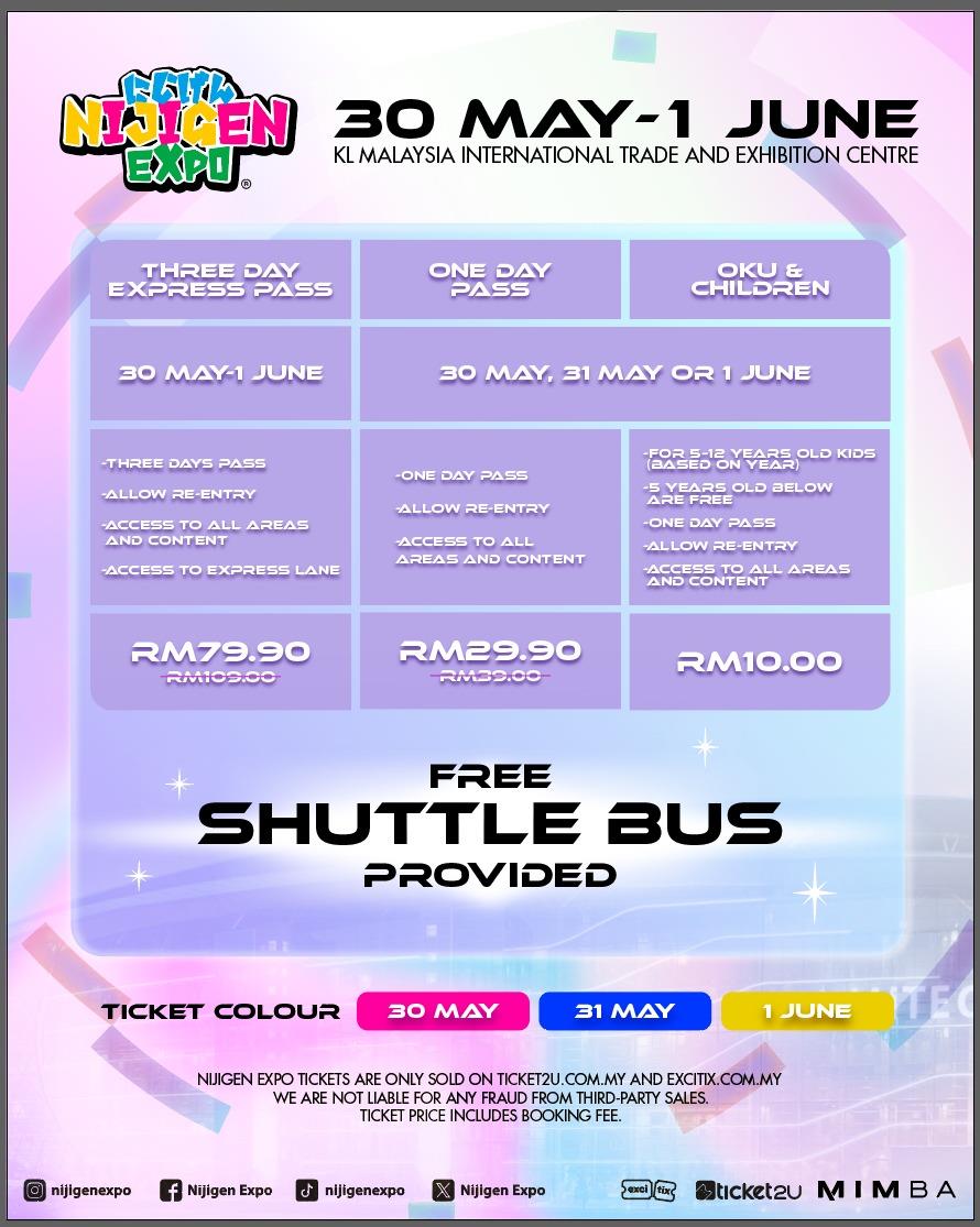Terms and Conditions1. Please redeem your tickets with the QR code that will be sent to your email after your purchase. The redemption counter will be place at the entrance during the event.2. If we are open for early redemption before the event, details of the location will be announced in our official social media.3. Ticket sold is non-refundable, non-exchangeable, not for resale and non-replaceable.4. Nijigen Expo reserves the right to deny your entry if you have violated the rules in the event.5. Nijigen Expo reserves the right to vary and amend any of the terms and conditions without prior notice.6. Nijigen Expo ticket is only sold via Ticket2U.com.my. There is no other third party selling the ticket.7. We are not responsible for any damage or fraud caused by any third-party sales.8. Each ticket price EXCLUDES booking fees.