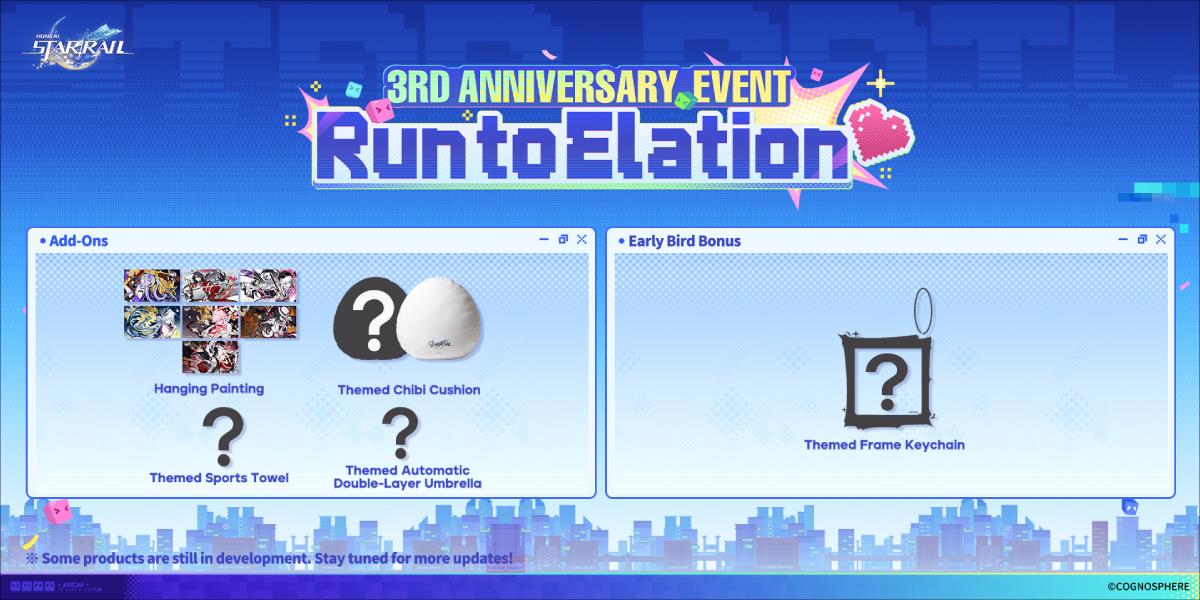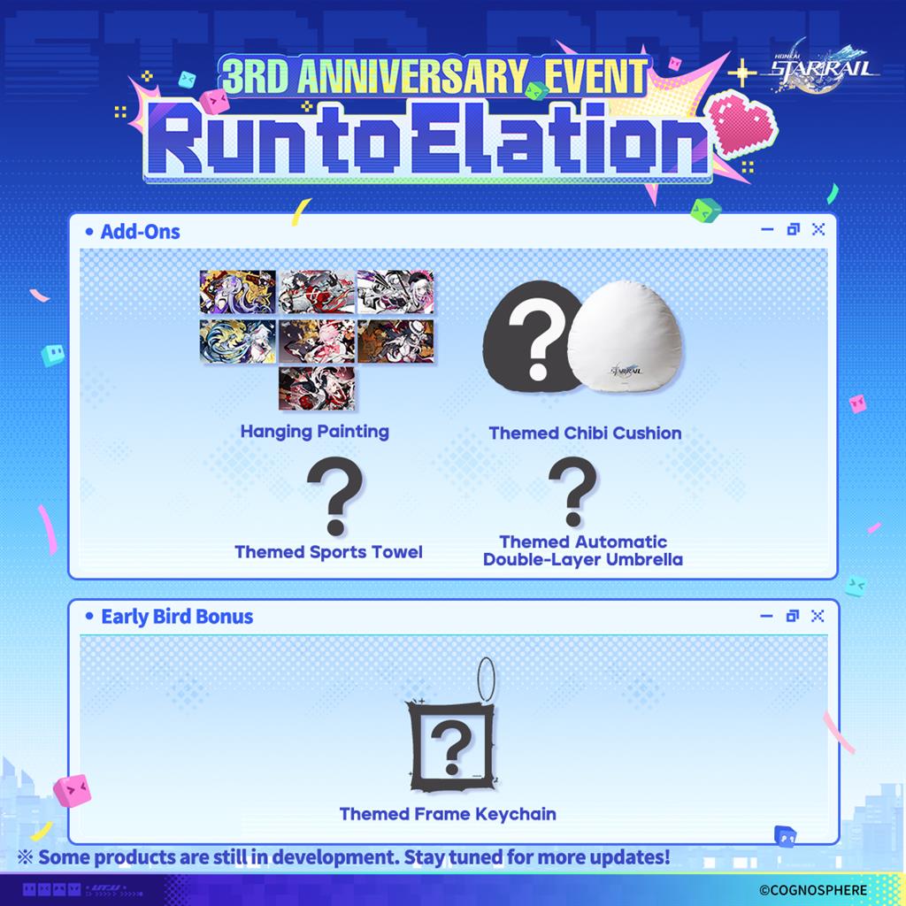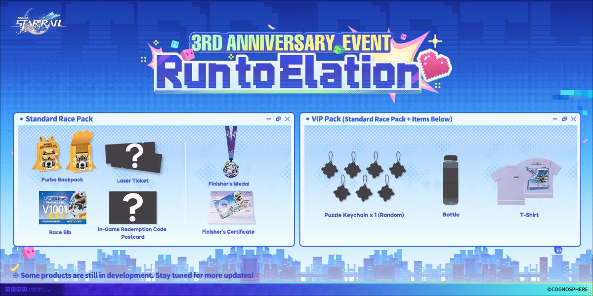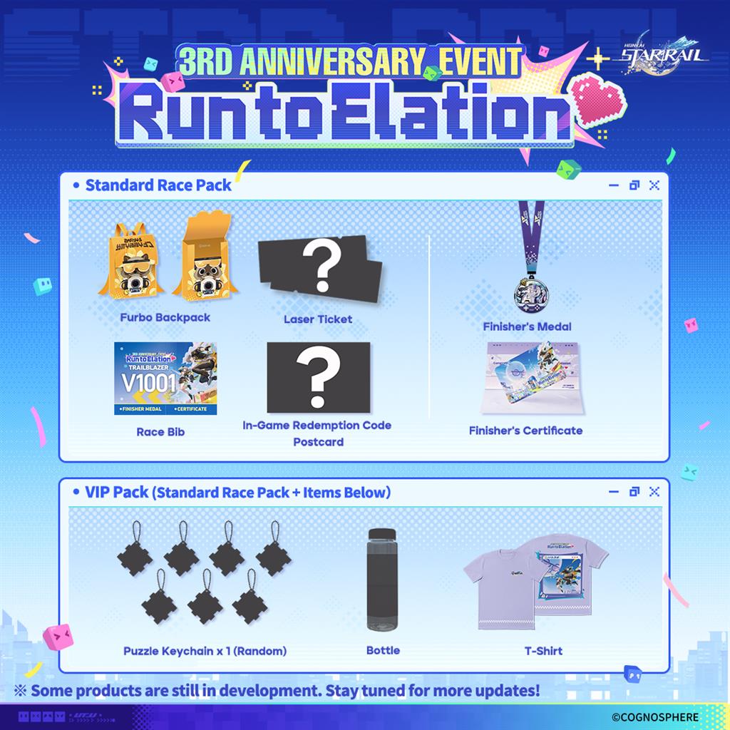 Participant Entitlements | ALL PACKS: - Run to Elation♥ Laser Ticket - Run to Elation♥ Race Bib - Run to Elation♥ Furbo Backpack - In-Game Redemption Code Postcard - [FINISHER ONLY] Run to Elation♥ Finisher's Certificate with Sleeve - [FINISHER ONLY] Run to Elation♥ Finisher's Medal