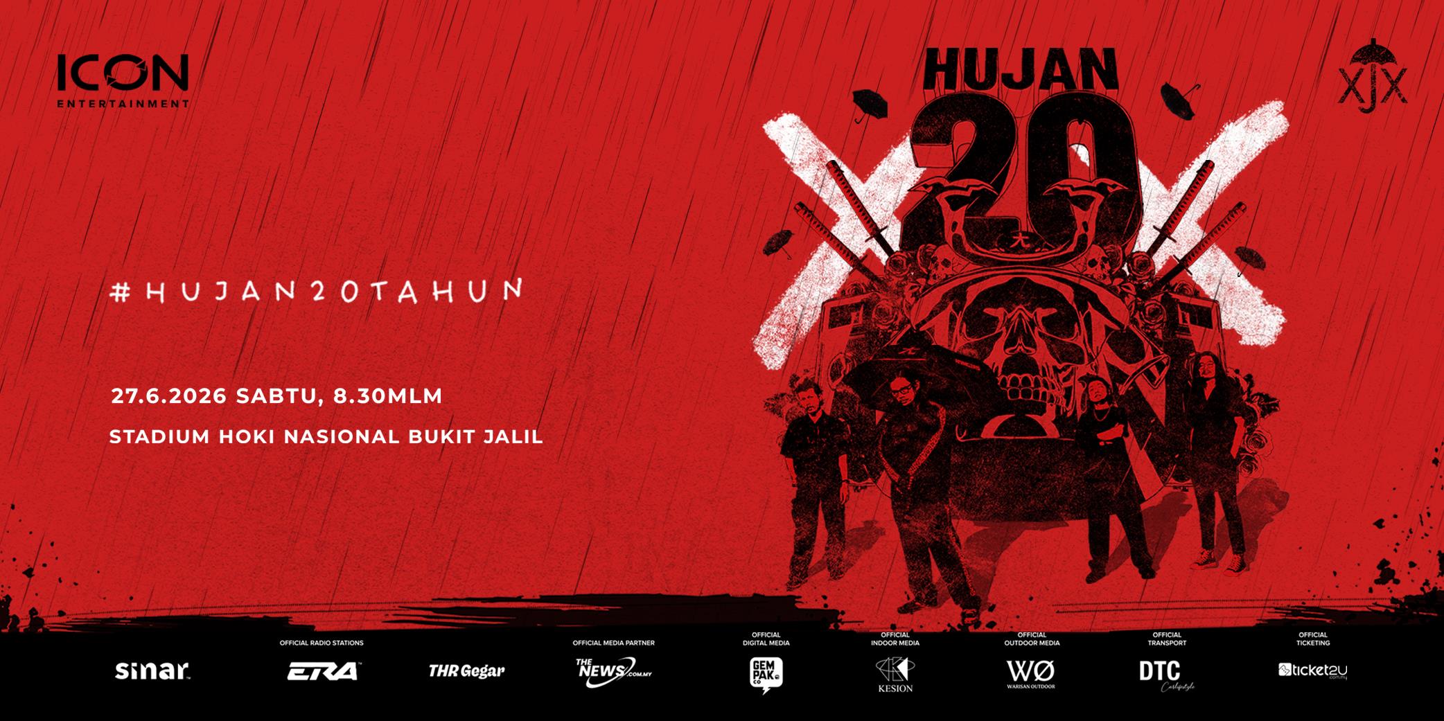 ⚡️ RASMI! Info penuh buat Raingers & semua yang ternanti nanti!⚡️Jom Kita Riot!! ☔️HUJAN XX : #HUJAN20TAHUNTarikh: 27 Jun 2026, SabtuMasa: 8.30 malamLokasi: Stadium Hoki Nasional Bukit JalilUlangTahun ke 20 @hujanband