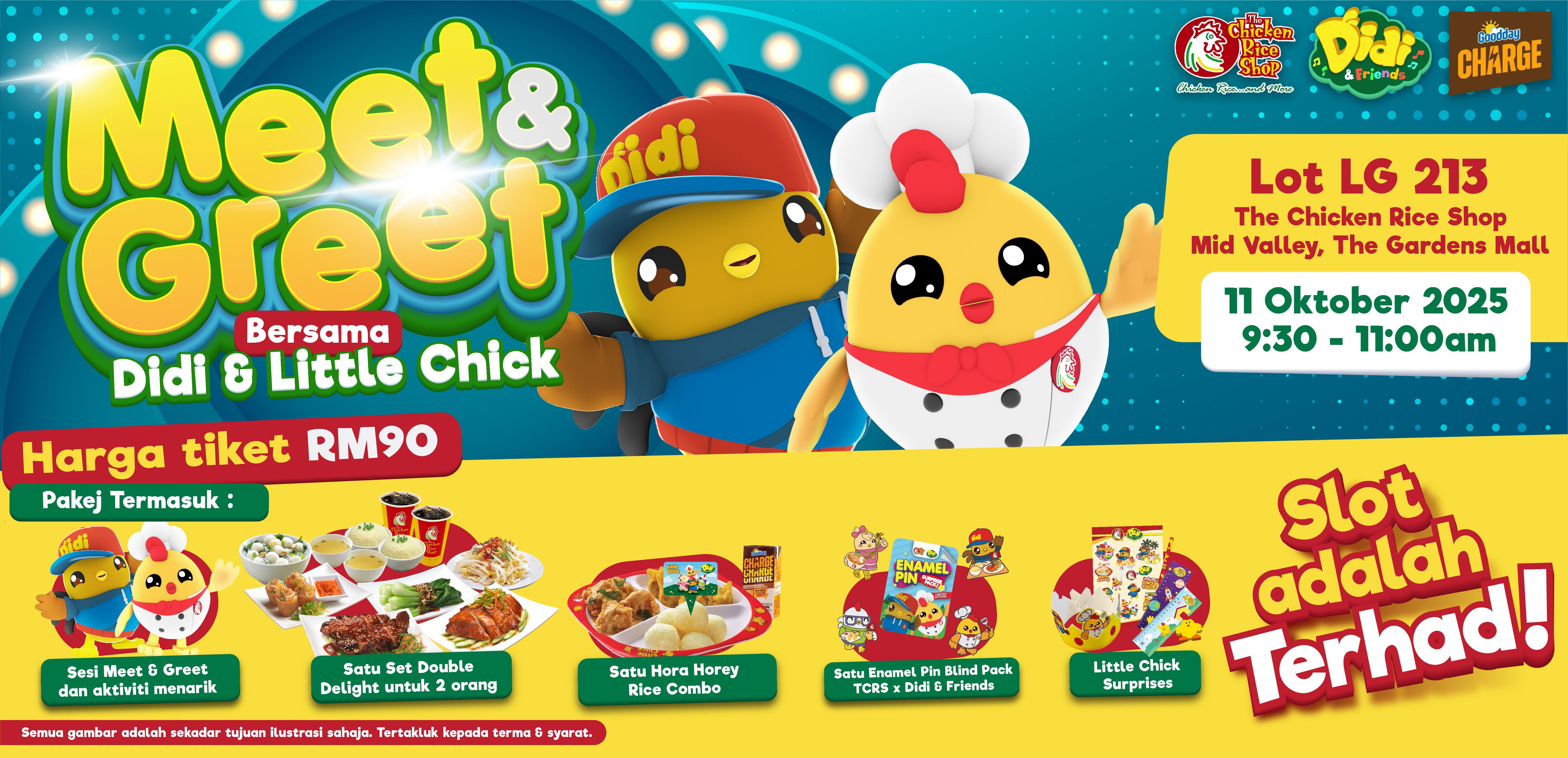 | Meet & Greet Bersama Didi & Little Chick | Sat, 10/11/202510/11/2025 The Chicken Rice Shop (The Gardens) Mid Valley City | |