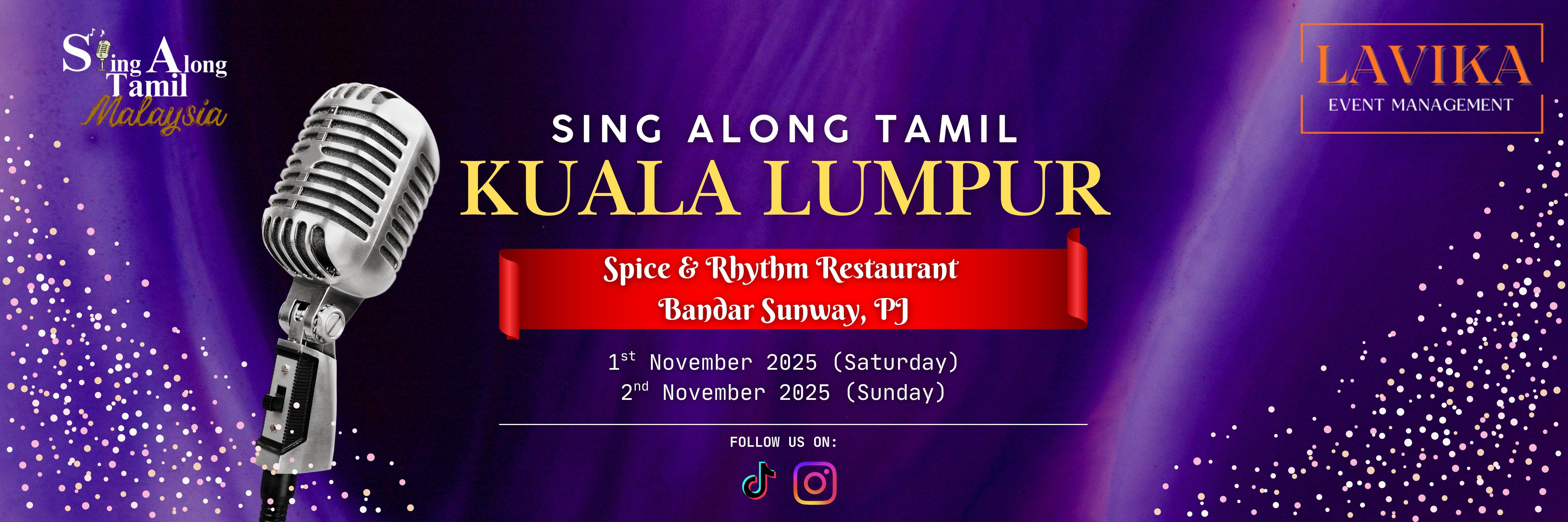 | Sing Along Malaysia (Tamil) KL | Sat, 11/1/2025 - Sun, 11/2/2025 Spice & Rhythm 19, Jalan PJS 11/28b, Bandar Sunway, 46150 Petaling Jaya, Selangor, Malaysia | |