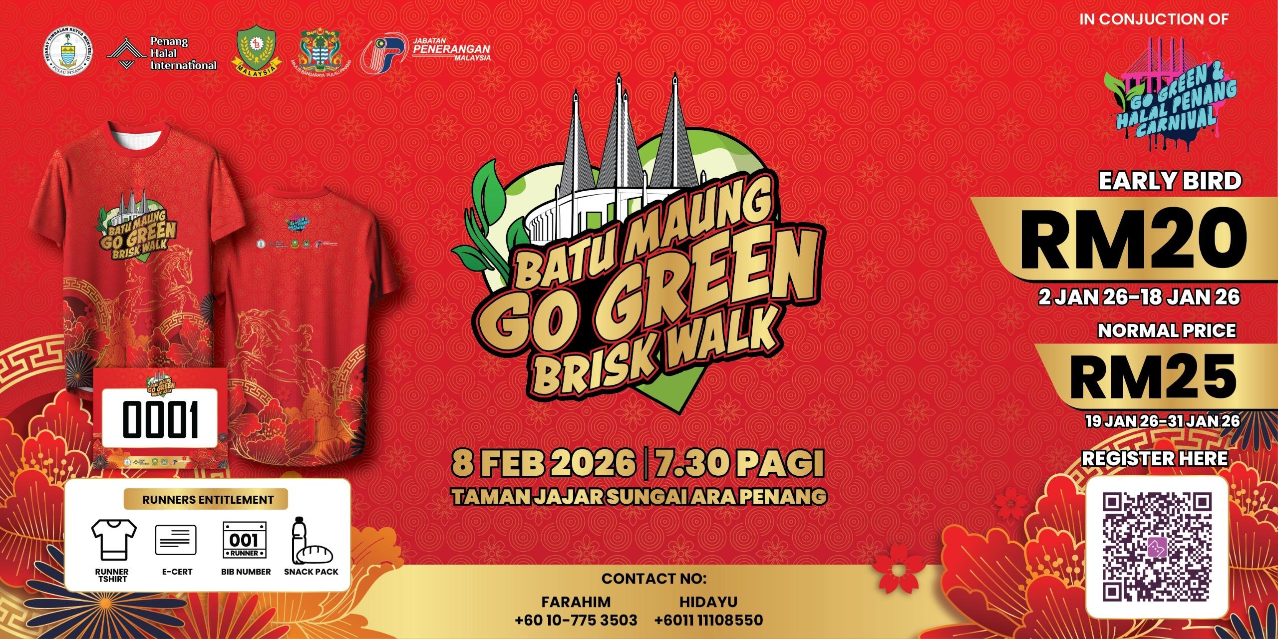 | BATU MAUNG GO GREEN BRISK WALK | Sun, 2/8/20262/8/2026 Taman Jajar Sungai Ara Lrg Kenari 1, Sungai Ara, 11900 Bayan Lepas, Pulau Pinang, Malaysia | |