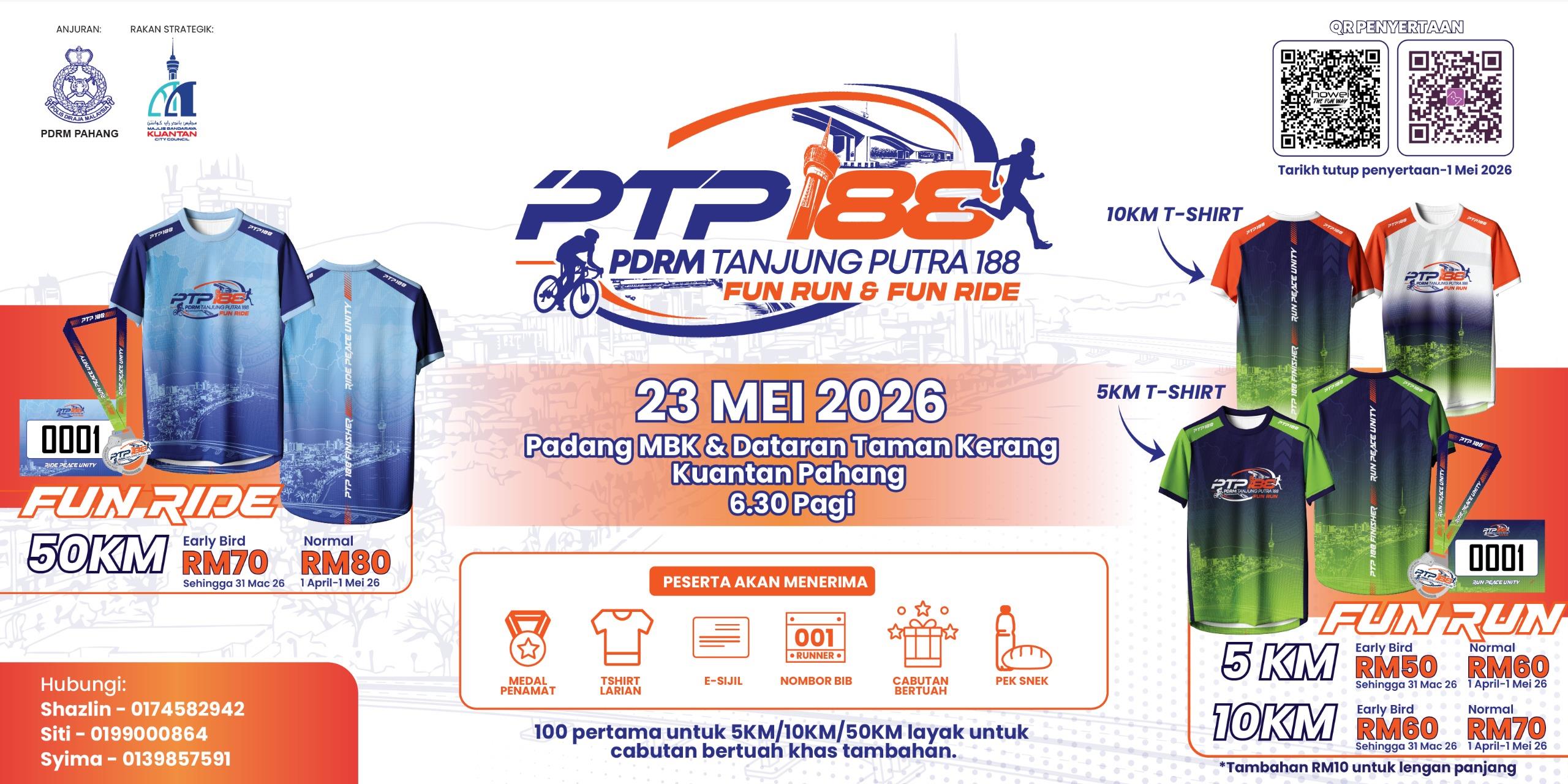 | PDRM Tanjung Putra 188 (PTP 188) Fun Run & Fun Ride 2026 | Sat, 5/23/20265/23/2026 Taman Kerang Jalan Mahkota, Kompleks Pentadbiran Kerajaan Negeri Pahang, 25000 Kuantan, Pahang | |
