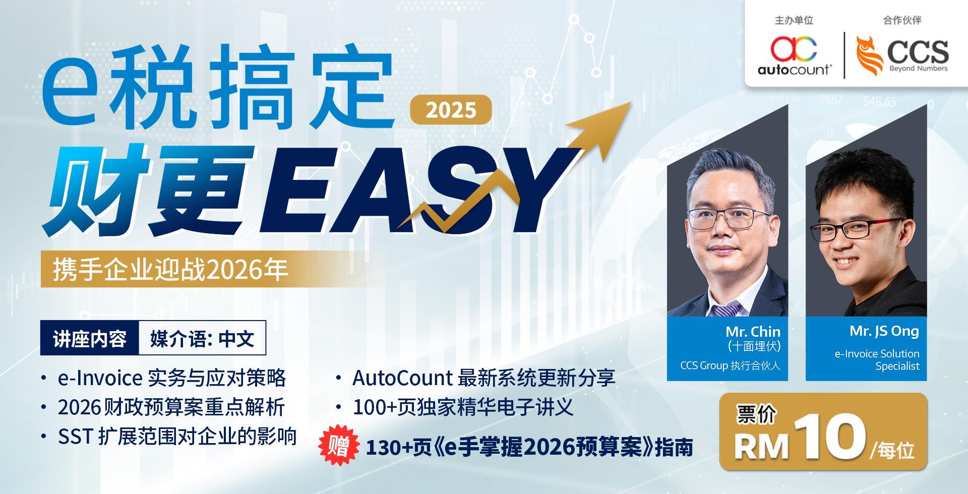 | 《e目了然 学e发票 2.0》2025全国巡回 【芙蓉站】 | Fri, 3/7/20253/7/2025 Dewan Perhimpunan Cina Negeri Sembilan 13 Pusat Komersial Lobak 1 | |